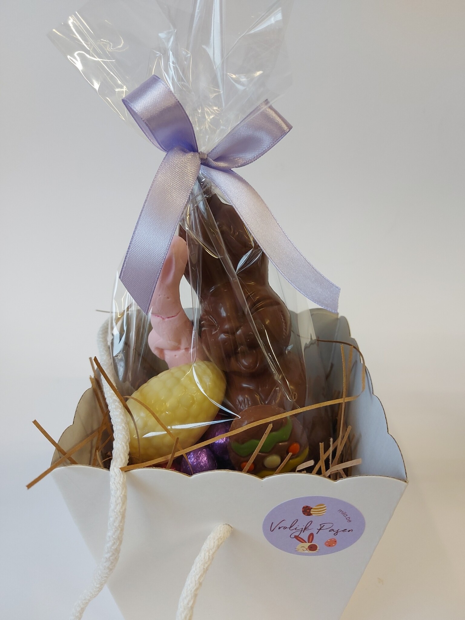 Draagmand gevuld met lachhaasje en assorti eitjes.